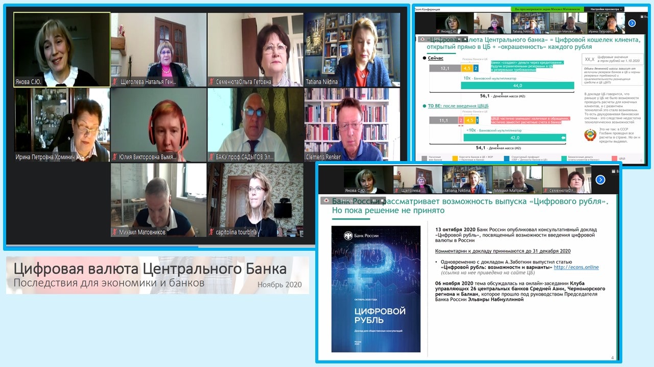 Участники научно-практической дискуссии обсуждали вопросы, посвященные особенностям современного развития финансовых рынков. Вопросам особенностей введения Банком России цифровой валюты с точки зрения критического анализа возможных последствий для экономики и бизнеса, в том числе угроз для банковской системы в области кибербезопасности, был посвящен доклад старшего управляющего директора - главного аналитика ПАО Сбербанк Матовникова М.Ю.